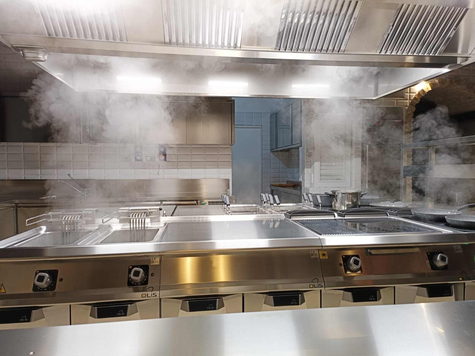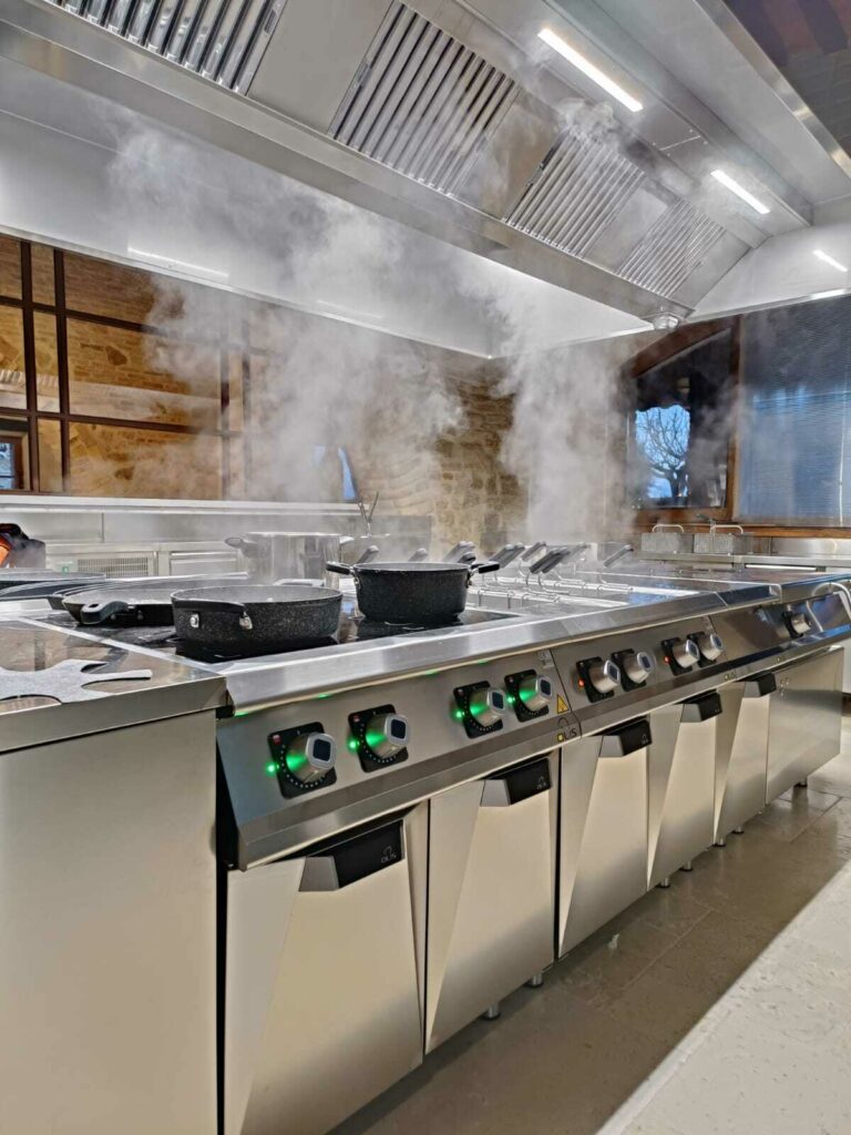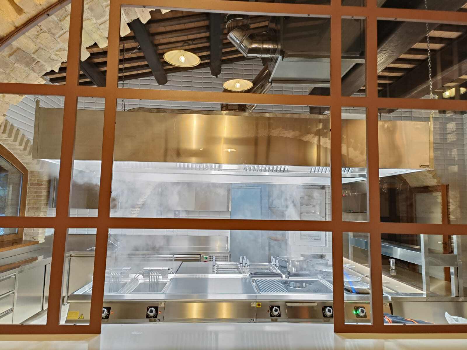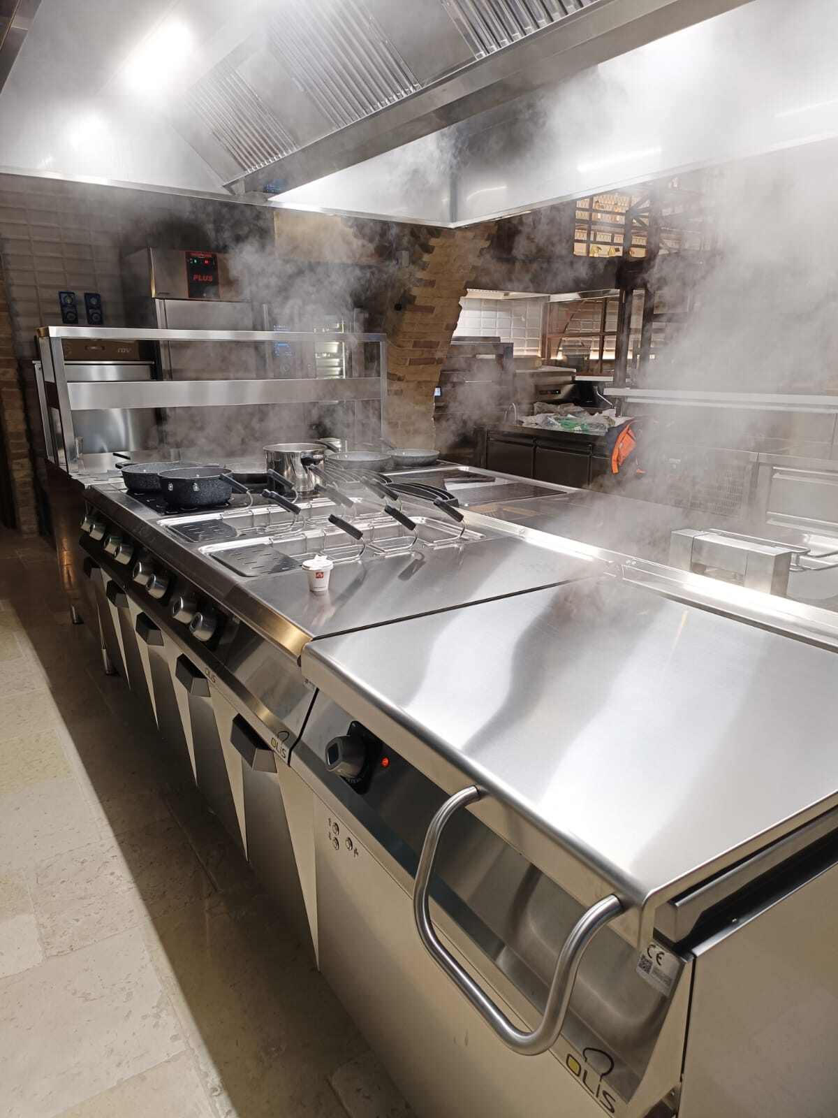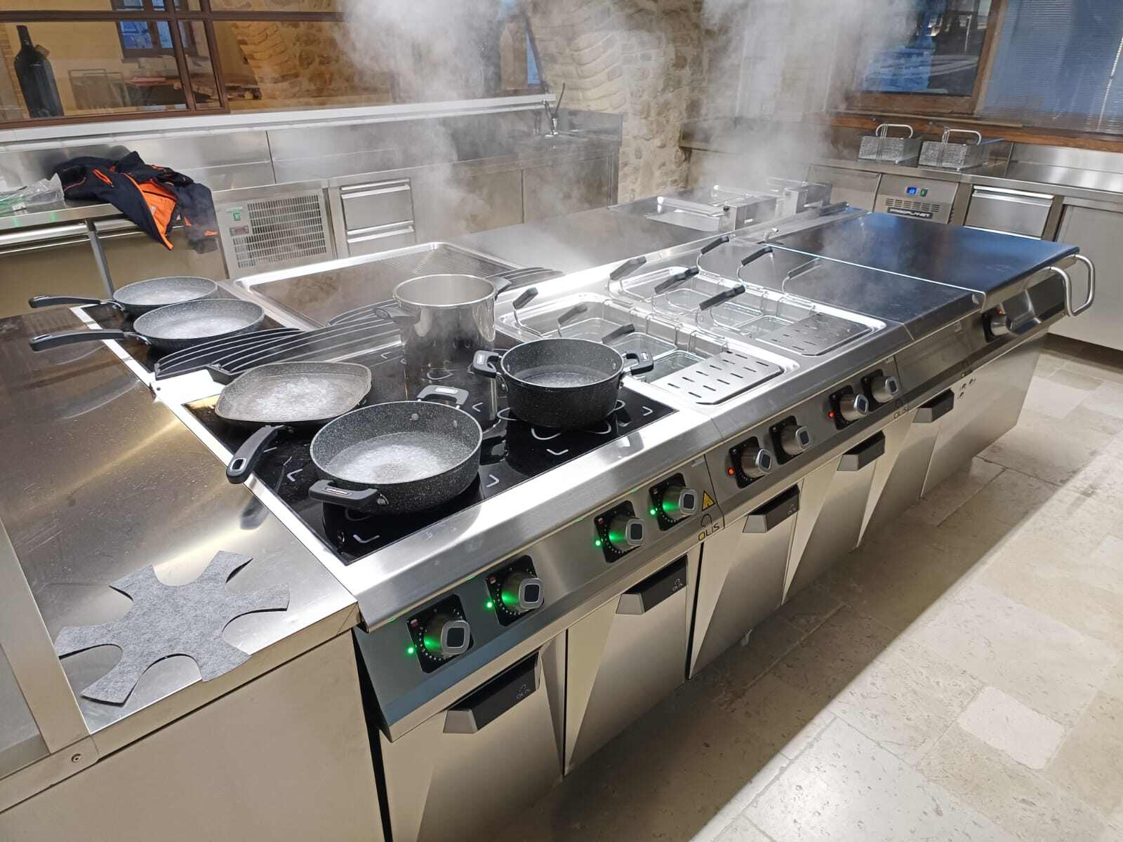 The heart of the block includes: an induction with four areas, , a wide capacity bratt pan, a Superfrytop a double fryer and a glassceramic range.Â