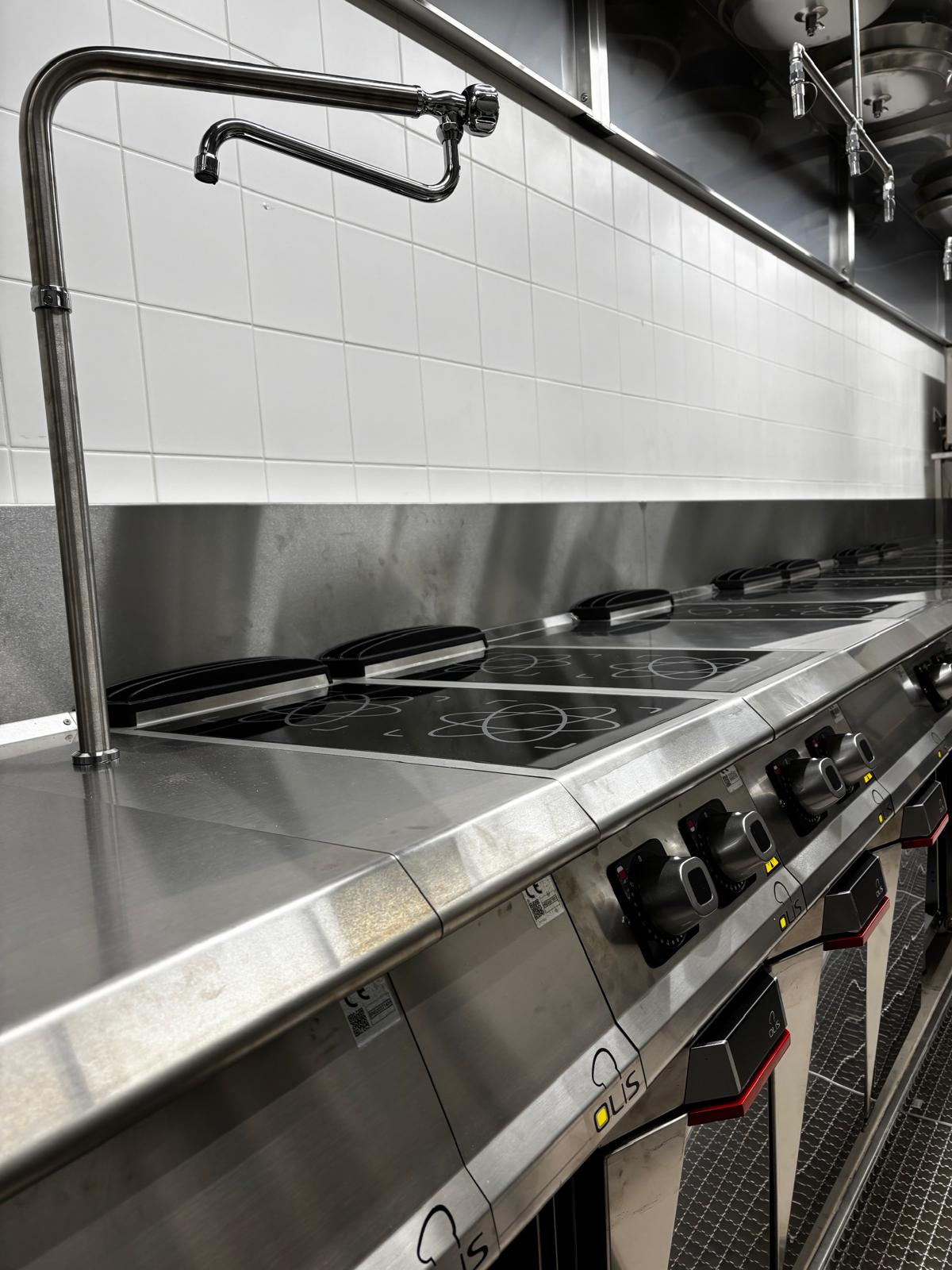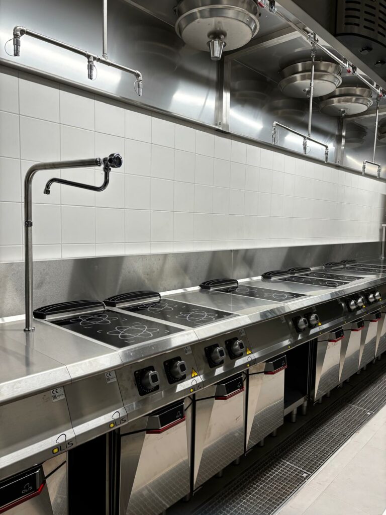 Pour garantir un service de restauration efficace et de haut niveau à l’intérieur du complexe, une cuisine centrale large et fonctionnelle a été réalisée, équipée de plusieurs postes à induction, en mesure de supporter des volumes élevés de production. La conception et l’optimisation de cette zone stratégique ont été prises en charge avec le soutien technique de Poziom21, partenaire de confiance d’OLIS, qui a contribué à la définition des espaces et des solutions opérationnelles les plus efficaces pour assurer performance, continuité et qualité dans le service en choisissant les produits performants de Diamante90.